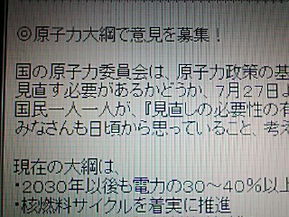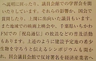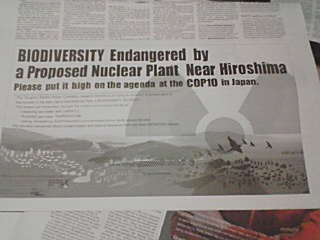 私たちは放射能汚染や低線量放射能による内部被曝についても憂慮しています。私たちはCOP10参加者に、この上関原子力発電所を今回の会議の論点とすると同時に、日本政府が真剣に生物多様性保全への政策を実施するよう強く働きかけることを要請します。 |