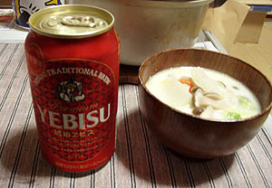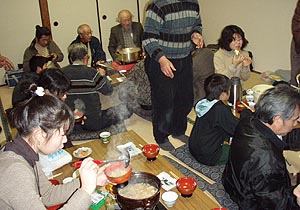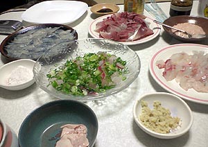 その後、センセイの釣ったタイとアジとハゲとヤズの刺身で新年会。車を運転しないといけない僕とみっちさん以外はエビスを旨そうに飲んでいた(ーー;)。うみとそらのたまごは「ゆで卵にするのはもったいない」とのヒロコオバサンの意見で「たまごかけご飯」で食べた。ぼくとみっちさんは「大根おろしかけご飯」も「旨い旨い」と食べたが、意外なことに他の3人にはなじみのないメニューだったようで、変な顔をして見ていた。旨いのになぁ・・・(^_^;) |