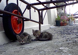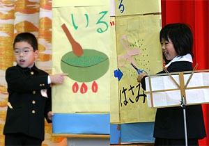 昼便に乗って田布施へ、祝島ネット21で制作するカレンダーのデザインの最終打ち合わせ。そのあと柳井の「しらかべ学遊館」に行き、繁田先生から原稿をあずかった。当時の写真を貼り付けたアルバムも持ってきてくれていたので、パラパラとページをめくってみると、懐かしくて笑える写真がいっぱい(~_~;)。その1枚が右の写真。左の子は賢そうだけど、右の子は・・(ーー;)。前歯も抜けちょるし・・(ーー;)。 |