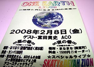 昨日のアースデイ打ち合わせの時にSKATYさんから「ONE EARTH LIVE!!」のパンフレットをもらった。六ヶ所村ラプソディの上映会の時にトークをやっていただいた富田さんと、懐かしくて怪しいアコちゃんが出演するようだ。SKATYさんのライブもある。2月8日(金)、昼は山口市の「はりはり」で、夜は美東町の「まなまな」で行われます。今回のテーマは原発です!地球の未来のために私達に何ができるのか・・興味のある方はぜひ! |