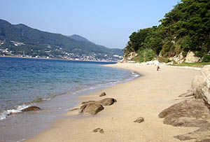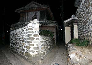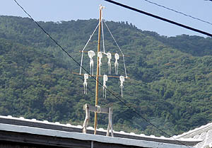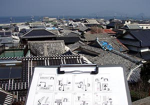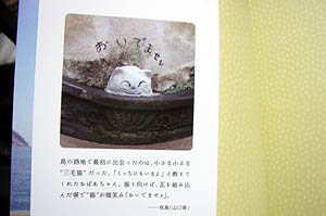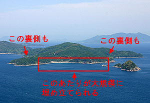 某所にて伊能図(江戸時代に伊能忠敬が製作した地図)が見られるという噂を聞きつけて、特別に見せてもらった。驚異的な正確さにたまげた。今の地図とほとんど変わらない。祝島なんか、そのまんまと言ってもいいくらいだ。島の名前は当時呼ばれていた「岩見島」と書かれていたが、その横に「又祝島」とも記されていた。島の上に旗のような記号がいくつか書き込まれていたが、そこが測量した場所なんだろうか? ちなみに伊能図には竪が浜という地名も書かれていて、ここは現在は熊毛南高校がある場所だが、この当時はまだこのあたりは海の近くだったようだ。 |