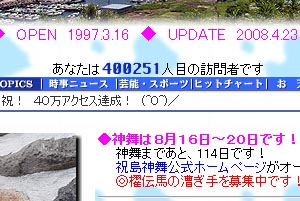 さて、神舞公式ホームページは今日の夜中のデビューを予告していたので(~_~;)、とにかくやらねば・・と、夜中の1時ごろからカウンターや掲示板の設定をして、なんとかデビューにこぎつけた。 やれやれ( ^^) _U~~。 「思い出掲示板」っていうコーナーがあるので、皆さん、昔の神舞の思い出など書き込んでくださいね!アドレスはhttp://iwaishima-kanmai.jp/ |