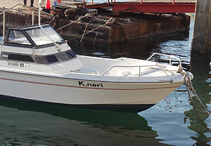 室津に出てキップ売り場に行くと、いつも「いわい」の反対側に留めている船がなんか変わっているのに気づいた。船名を見ると「K,neri」と書いてある。「変わった名前じゃの〜・・ん?K練?」「もしかしてK練さんに関係ある?」と気づいて、みっち探偵所に調査依頼を出したら、すぐにK練さんのところの船ということが判明。なかなか優秀な探偵だ(^o^)。それにしても、この名前、よく付けたなぁ・・(^_^;) 家に帰ったら、兄貴が風邪で寝込んでいた・・(ーー;) |