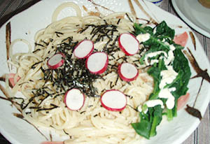 アパートに帰って、ベランダ菜園の最後の1本のラディッシュを引き抜いて、スパゲッティにトッピングして食べてみた。見た目はきれいだったが、味付けがイマイチだった(ーー;)。 |