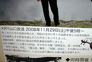 こないだ「しらかべ学遊館」に行ったときに貼っていたポスター。国木田独歩 没後100年記念特別番組「青春の置土産」という番組が明日の午後五時からKRYテレビで放送されるらしい。山口放送の制作。田布施とか平生とか柳井とかが出てくるようだ。 |