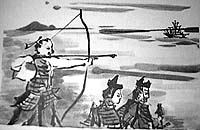 と命令しました。助左衛門は、自分の腕前を見せるのはこの時とばかり、高台にのぼり、船が見下ろせる所から、大きな弓に四尺(約1.2m)もある長い矢をつがえ、力一杯引き絞って、