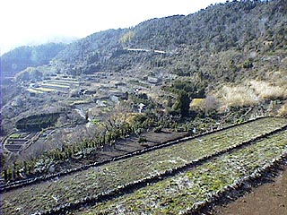 「段々畑」(急勾配の山の斜面に作られた段々畑。)