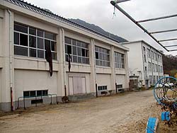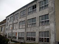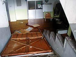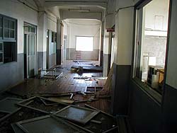 | 中学校は大きな被害を受けました。 入り口や階段の踊り場、2階の教室の窓が割れたり、枠ごと飛んだりしています。写真には写っていませんが、玄関や2階の非常階段の戸も飛ばされています。 |
