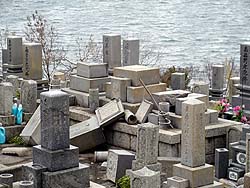 | お墓もかなりの被害を受けています。撮影した前日に数名で、直せるものは直したらしいですが、まだかなりの石塔が倒れたままになっていたり、ズレていたりしていました。上の写真は東の墓です。 | ||