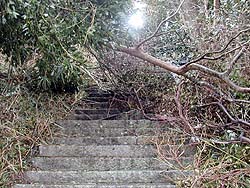 | 宮戸八幡宮の境内も悲惨な状況に | 手水鉢の屋根も壊された | お宮に上がる階段には折れた木がかぶさっている。お宮の海側にあった木の多くは折られて吹き飛ばされてしまいました。 |