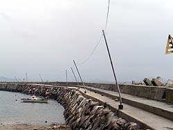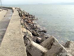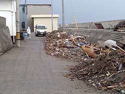 | 東波止の電灯線の支柱は、すべて根元から曲げられて西に傾いている | 東波止の外側に積んであったテトラポットが約20mに渡って、ごっそり姿を消した。どこに消えたのだろう? | 海岸の道路に打ち上げられた流木やゴミや石など。掃除して道路脇に積まれている。 |
