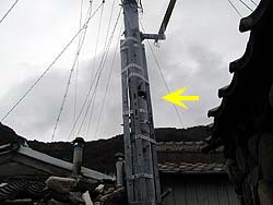 | 河村さん宅は海側の屋根がゴッソリ飛ばされた | 河野さん宅も被害 | 矢印のところで「く」の字型に折れた電柱。応急処置で補強されている |
