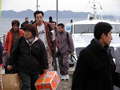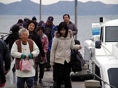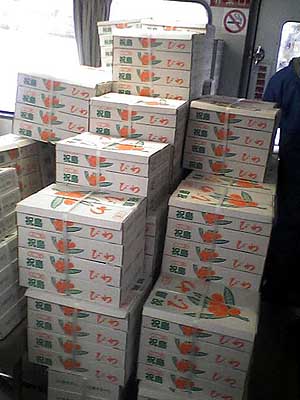 5月末から特産のビワの出荷が始まりました。定期船(昼便)には箱詰めされたビワが所狭しと積み込まれます。ただ、今年は冬に2回の積雪があったためか、収穫量は例年の3分の1程度のようです。