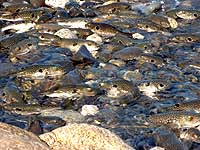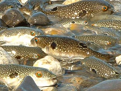 6月13日(日曜日)の午後、ヨボシの海岸でクサフグの産卵が見られました。近郊では室積の象鼻ヶ岬の海岸のクサフグ産卵が有名ですが、祝島でも昔から産卵が見られています。クサフグの産卵が見られる時期は6月の大潮の2〜3日前です。