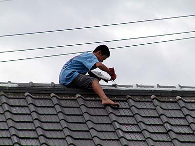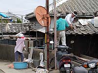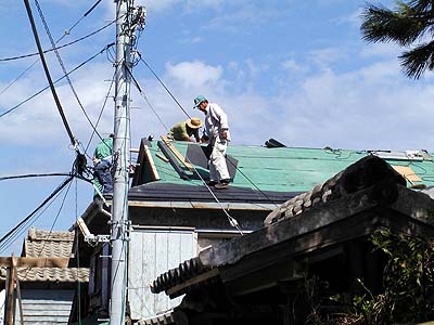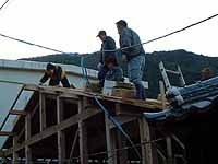 松原さん宅は全面瓦を張り替え中。 河野さん宅の工事。