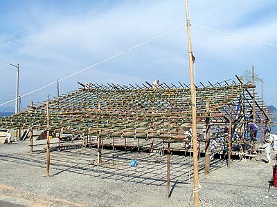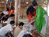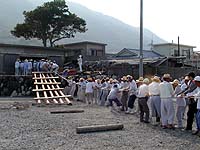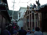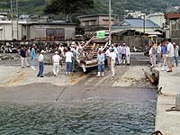 櫂伝馬も引き上げられます | 神舞小屋に使われていた竹は、 欲しい人が自由に持って帰って 畑の垣根などにリサイクルされます |