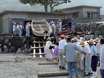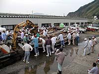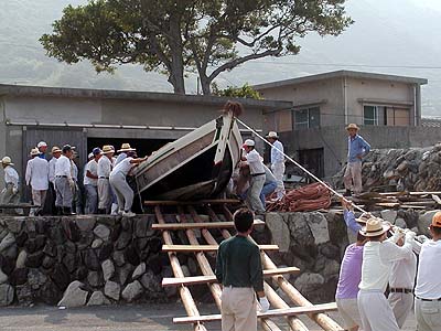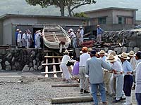 7月22日、櫂伝馬を倉庫から運び出しました。たくさんの島民の皆さんが力を合わせての作業です。