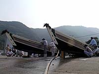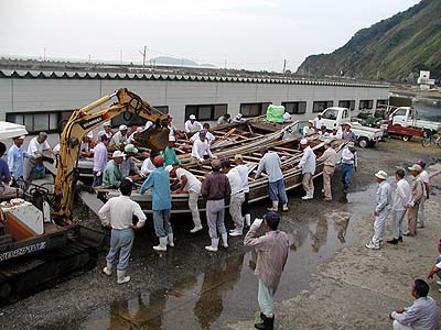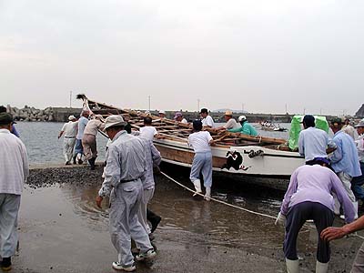 | 台風に備えて非難させていた櫂伝馬 | ソロソロと動かします | 作業は満潮時に |