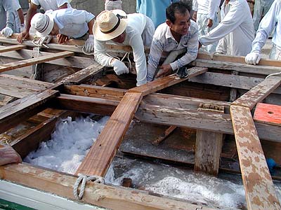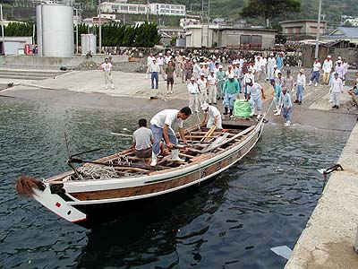 運び出した櫂伝馬の中には海水が流し込まれ、水漏れのチェックがされます。最初は木が乾燥しているので、隙間が空いていて漏るのだそうです。木が海水を含んで膨れ、そのうち漏れが止まるらしいのですが、そこまでには何日もかかるのだそうです。水漏れがひどい箇所は修理されます。
