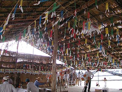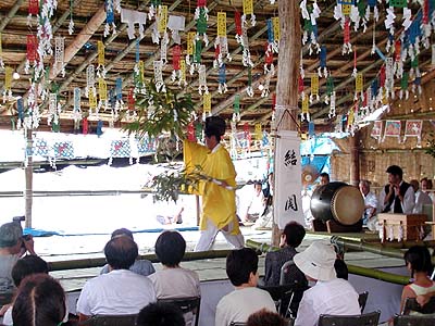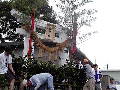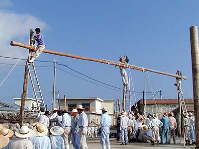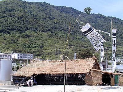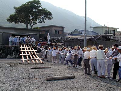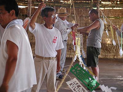 8月9日の早朝から神舞の小屋掛けが行われました。島民(男衆)総出で丸一日作業して、神舞の舞台である仮神殿が作られました。暑い中での作業、ご苦労様でした。