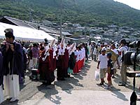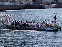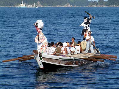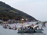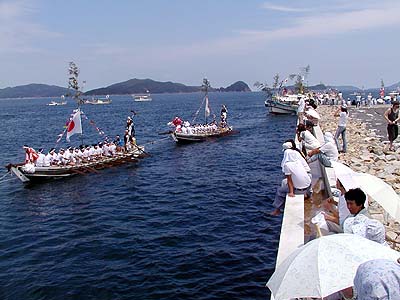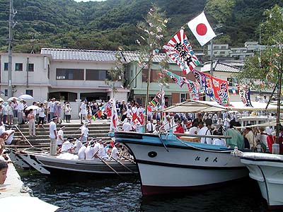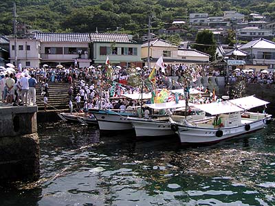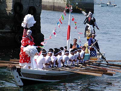 8月13日に入船神事の本格的なリハーサルが行われました。踊り手は衣装や化粧をつけ、引き舟・櫂伝馬・神様船を連ねての練習でした。帰省客もずいぶん増えて、見物人も多くなりました。