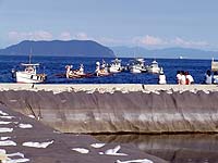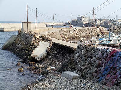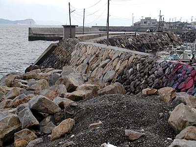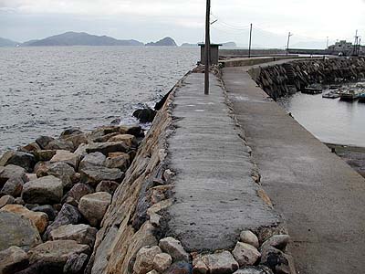 台風23号は祝島より東側を通ったので、島では18号ほどの被害はありませんでしたが、北西からの高波で西波止の付け根の部分が崩れてしまいました。かなり昔(明治時代?)に作られた波止で、わりと小さい石で作られていますが、今まで一度も崩れたことは無かったらしいんですけどねぇ・・・。