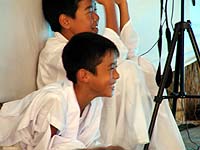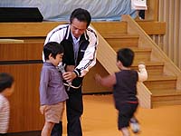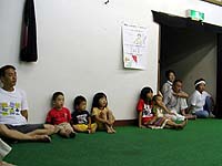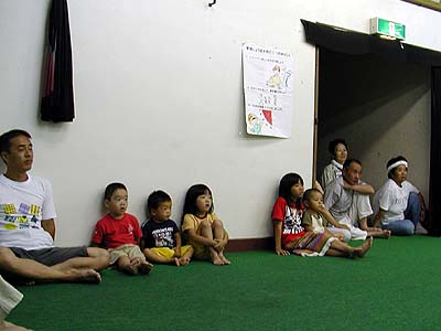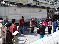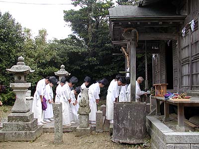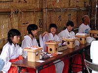 | 岡本さんの熱心な指導 | 将来の剣櫂・サイ幣・巫女さん候補 も練習を見つめます |