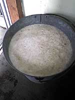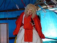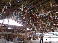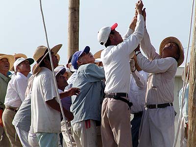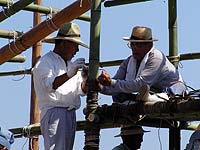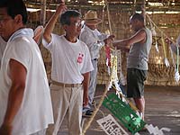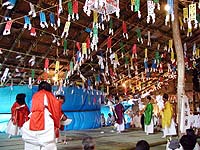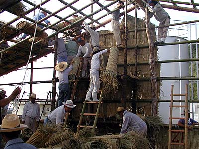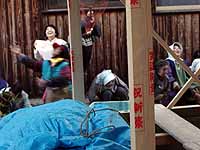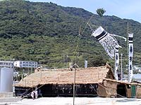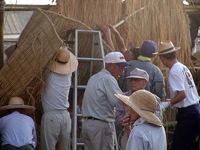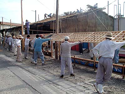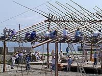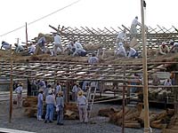 | こちらはオンボリの準備 | 小屋の前に鳥居を立てる | 苫葺きが終わり、天井を見上げる |