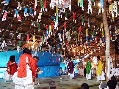 | ほぼ作業終了。華やかになりました。 | 祝島十六神の切り飾り | オンボリも準備完了 |