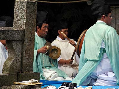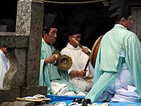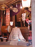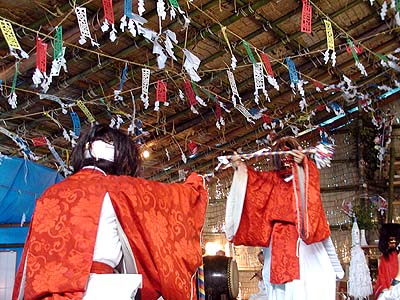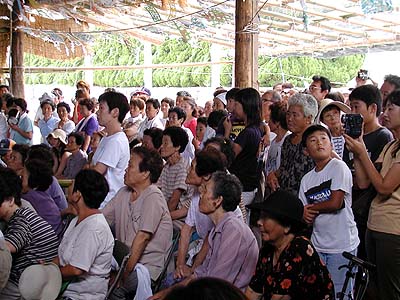 8月18日は台風の影響で強い風の中での舞いになりました。台風は明日が最接近ということで、夜8時過ぎまでかけて明日の分まで神楽を行いました。里楽師の皆さん、お疲れ様でした。
