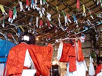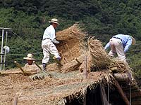 | 苫葺き作業開始 | 屋根の上でも身軽に作業 | 神棚付近です |