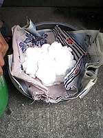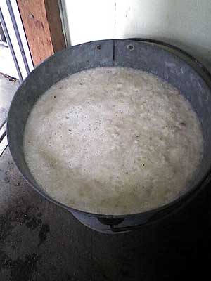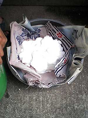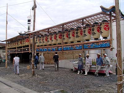 | 柱だけになりました。手前に干して いるのは舞場に使われていたゴザ。 |