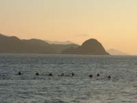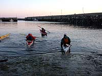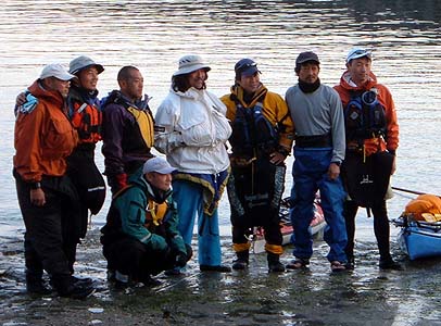 カヤック隊の面々 いざ、出発! 朝日の中を進んでいくカヤック隊