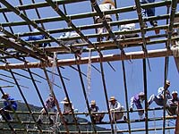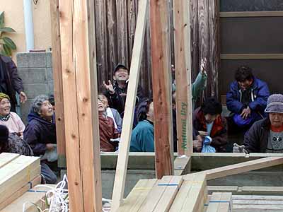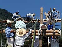 まずは梁の木を引き上げるところから | 梁を柱にしっかり結びます |