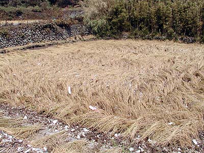 風で倒れてしまった稲。 刈り取りが大変だ。 |