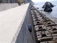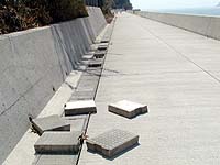 普段は海に水を流す土管から、 波の力で海水が逆行して 側溝のフタを吹き飛ばした模様 |