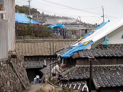 9月7日下関付近を通った台風18号により、祝島では大きな被害を受けました。数多くの民家で瓦が剥がされ、学校ではサッシの窓ガラス等が割れたり、給食室の屋根が吹き飛ばされたりの大被害でした。また7日の午前10時頃から三日間停電が続き、それに伴って水道の水が出なくなったり、電話が通じなくなったりしました。