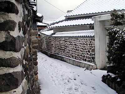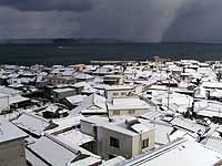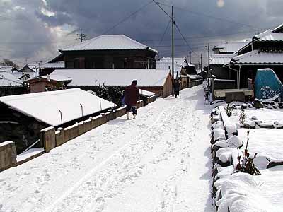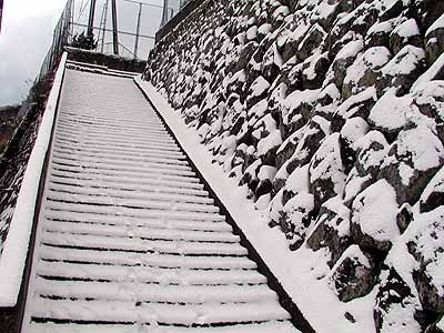 | 学校の階段も運動場も真っ白 よ〜く見ると中学校の玄関横に雪だるまが・・・ |