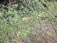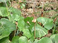 | 祝島日記(2) 「ツワ(ツワブキ)」 祝島はツワブキが結構あります。これも暖かさの恵みでしょう。秋には黄色の花で斜面をかざってくれ、春には新しい茎が食材になってくれます。フキより柔らかく、独特の風味があります。この頃山道を歩くと、ちらほら新しい茎が出ています。豆腐や、アブラゲ、(上関の)てんぷらと一緒に煮てもいいし、メバルの煮付けに入れてもいいし、いりこだしでツワだけでもいいです。「イリダイ」に入れるとなかなかです。(イリダイとは豆腐を具の主にした超濃いいみそ汁のようなもの) 皮をむくとき、あくで指先や爪が茶色になります。理髪店の奥さんの話では、固めに煮て冷凍しておくと夏でも食べられるそうです。てんぷらにして食べる人もいるということです。重宝な野の食材です。理髪店には収穫して、皮をむき、あく抜きのため水に入れたのがありました。 <2001年3月4日 木村 力>