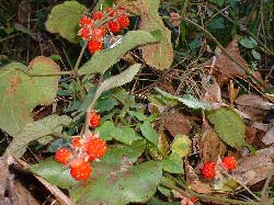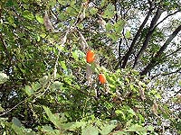 私がおじさん、おばさんと言っていた人たちが、だんだん山に来れなくなってきましたが、道ばたの実や花を見ては、いろいろな感慨をもって通り過ぎたことだろうなと、感傷を誘います。秋です。 何年か前に植えた柿の木が初めて実を付けていました。桃栗3年、柿8年と言うから、きっと8年前だったのでしょう。 <2001年10月24日 木村 力> |
