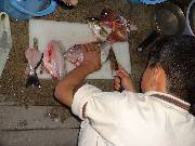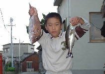 11月中旬。朝の凪の内に海彦になり、無人島の近くで釣りをしました。 昼過ぎに風が出てきたので、釣った魚を持って帰り、海彦2号に手渡し、私は山彦になりました。 ![]() 海彦2号の持つ魚はタイとイサキです。 祝島の段々畑にはミカンが色づき、ビワの花が咲いています。 ![]() 山から帰ってみると海彦2号が、魚をさばいていました。 ![]() タイをさばくのは初めてです。 ![]() 不揃いのにぎり寿司です。 <2001年11月14日 木村 力>