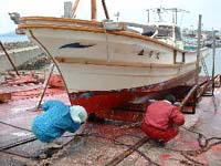 | 祝島日記(28) 「船たで」 12月23日に久しぶりの「船たで」をしました。 「ふなたで」というのは、船底をきれいにして、塗装する(船底塗料を塗る)事を言います。 今は、FRP船や、船底をプラスティックを貼った木船がほとんどですが、船底にプラを貼っていない木船の場合は、船虫害を防ぐために船底を焼いて木が腐らないようにしていました。その作業が「船たで」と言われていたのです。FRP船やプラを貼った木船の場合は、船底をきれいにして塗装を施す作業になり、焼くことはなくなりました。 そして、前は船底をこするのは棒ずりでしたが、今はコンプレッサーで水を噴射して汚れを落とします。フジツボは手作業で落とすになりますが。 ![]() 「船たで」 いとこのゆみさんが手伝ってくれました。 <2001年12月23日 木村 力>