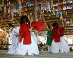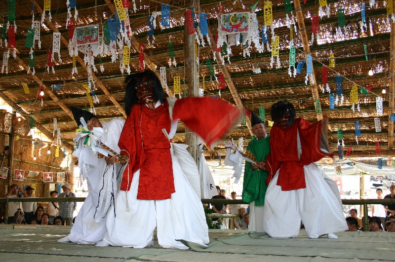 今から1120年余り昔、仁和2年8月、山城国(現在の京都)の岩清水八幡宮よりご分霊を奉持して帰途の豊後(現在の大分)伊美郷の神官たちが嵐に遭った際、祝島の人たちが助け、手厚くもてなしたそうです。お礼に五穀の種を分け、農耕と神を祀ることを伝えられたことで島の生活が向上したことに感謝し、毎年8月、祝島から伊美へ「お種戻し」の参拝が行われています。4年に一度の「神舞」は、島に招かれた神官たちとの合同神事。海上での勇壮な入船・出船神事と古式豊かな33の神楽舞が奉納されます。