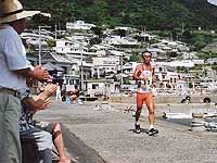 | 学校下の急坂 | 2km付近から長い登り坂が続く | 島民の出迎えを受ける |